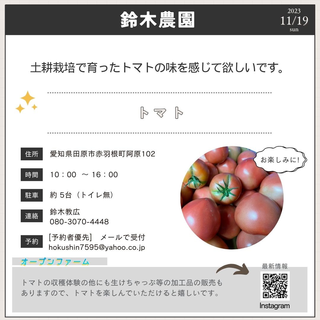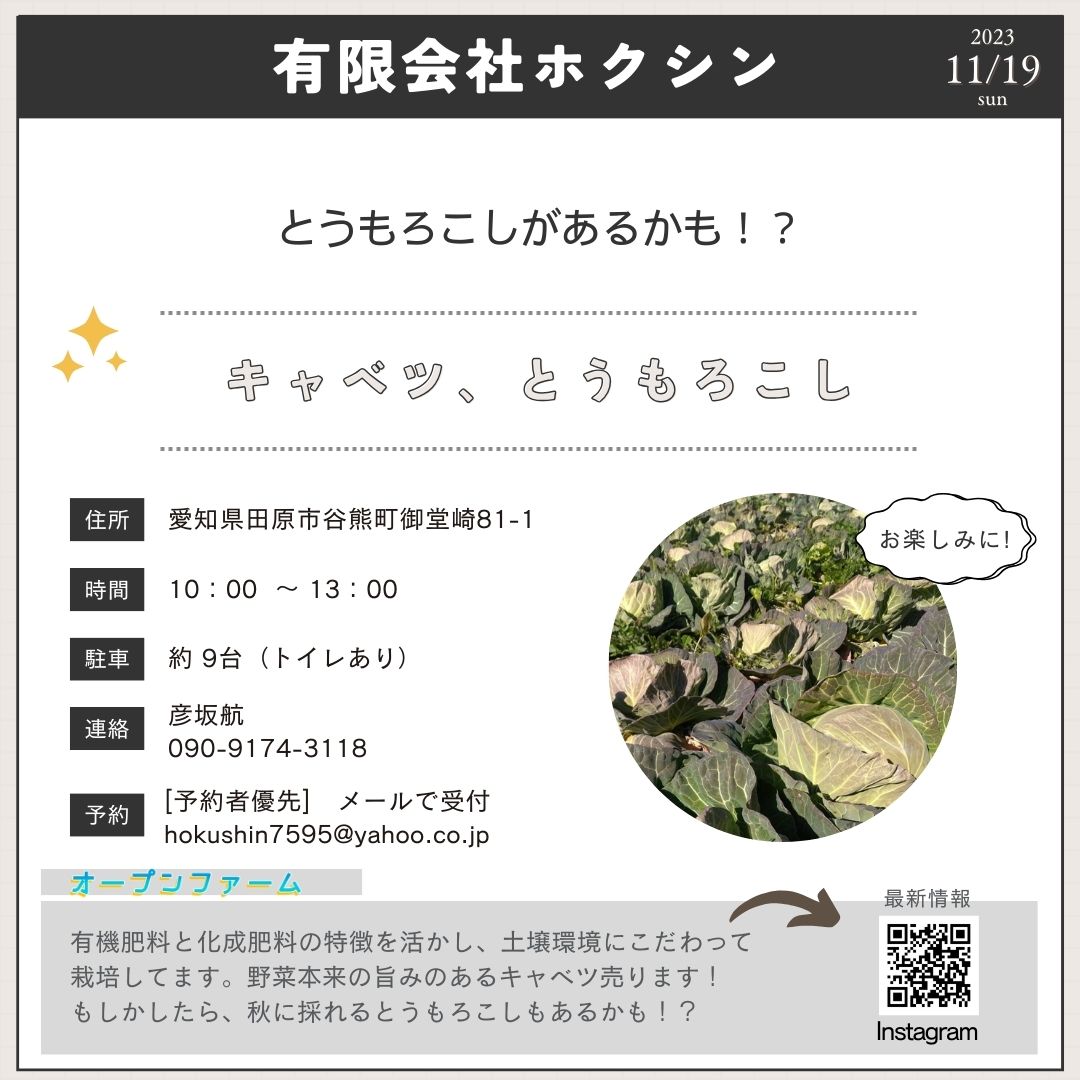 皆さんこんにちは。11月19日に、豊橋市と田原市でオープンファームが開催されます。