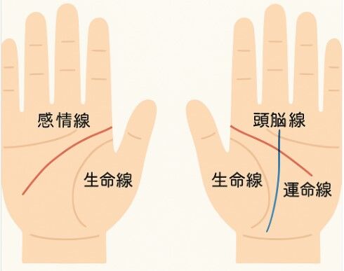 赤い線が頭脳線で青い線が運命線じゃな。